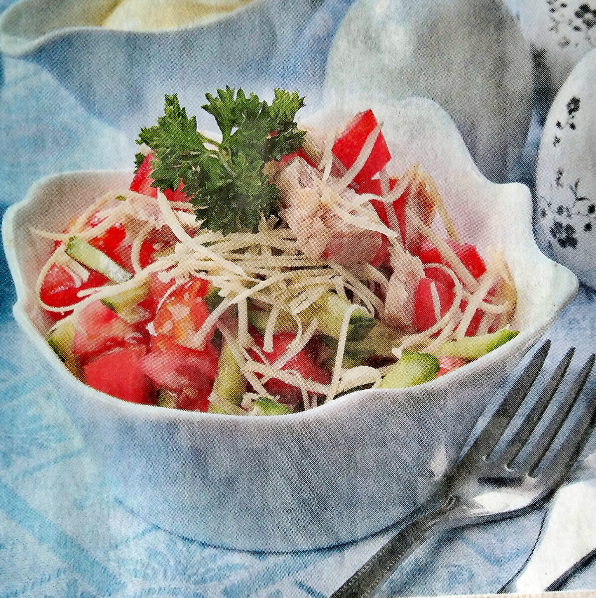 Куриные грудки отварить до готовности. Остудить и нарезать небольшими кусочками. Огурцы нарезать соломкой. Сыр натереть на мелкой терке. Помидоры нарезать брусочками или кубиками. Непосредственно перед подачей перемешать все составляющие, добавить чеснок и заправить густым майонезом. Соль по вкусу.