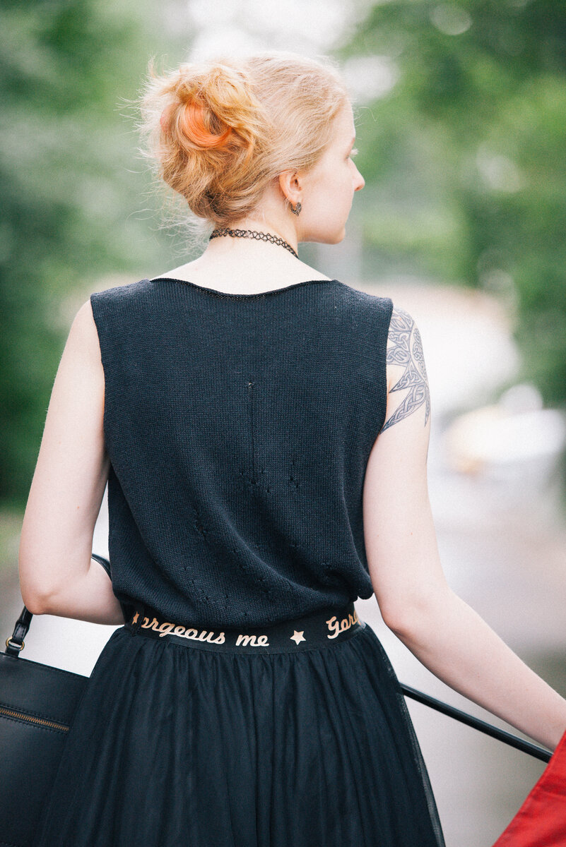 Итак, народным голосованием мы решили ввести новую рубрику о том, с чем лично я ношу вязаные вещи, как их комплектую и все это сопровождаем фото. В 2019 году у Марины Сорокиной был отвязан вот такой топ-майка. На тот момент это еще была и крайне актуальная дранина (впрочем, актуальности пока еще не потеряла до сих пор) :) Поднимаем оооочень старые записи: Майка из шелка шнурок 400/100, машина 5кл плотность 5, ширина 54 длина 66, стирка на шерсти с nordland, вес 300 гр. Изначально топ носила моя дочь вот в такой комплектации: А поскольку мы, в общем, по размеру не очень сильно отличается друг от друга, то вещи всегда можно считать общими: И в этом году этот топ ношу я. Вариант 1 - топ в виде жилета на футболку (я б футболку взяла побольше, рукав пошире, пройма позволяет. Этот нюанс стал виден только на фото. Кургузость футболки "в зеркале" была не так заметна, а вот при отстраненном взгляде ее надо явно брать больше, будет однозначно лучше. В комплекте "интересные" черно-белые прямы