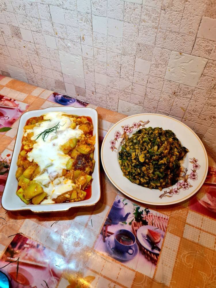 Рецепт подсмотрен у одной турецкой женщины, ведущей кулинарный блог. Немного адаптирован в отношении блюда на сковороде- это уже я сделала по-своему 😋 #июль Ингредиенты: крупных кабачка, Лук репчатый, Лук перо, Укроп, Рис, Мука твердых сортов Пудов (крупка), Оливковое масло, Растительное масло, чеснока, Соль, чёрный перец, копчёная паприка, Минеральная вода, Мацони Способ приготовления: Подготовить ингредиенты. Кабачки хорошо помыть и снять внешний слой тонкими слайсами. Немного добавьте слайсов с очищенной части кабачка. Очищенные кабачки порежьте брусочками, ломтиками, кусочками. Репчатый лук порезать полукольцами. Мелко нашинковать лук-перо и укроп. В кастрюлю с толстым дном налить оливковое масло. Разогреть и в дальнейшем готовить на среднем огне. Когда масло нагреется, в кастрюлю добавить репчатый лук, посыпать чёрным перцем по вкусу, перемешать, затем закрыть крышкой и готовить 4-5 минут. Добавить нашинкованную зелень к репчатому луку по очереди, постоянно помешивая. Добавить сл
