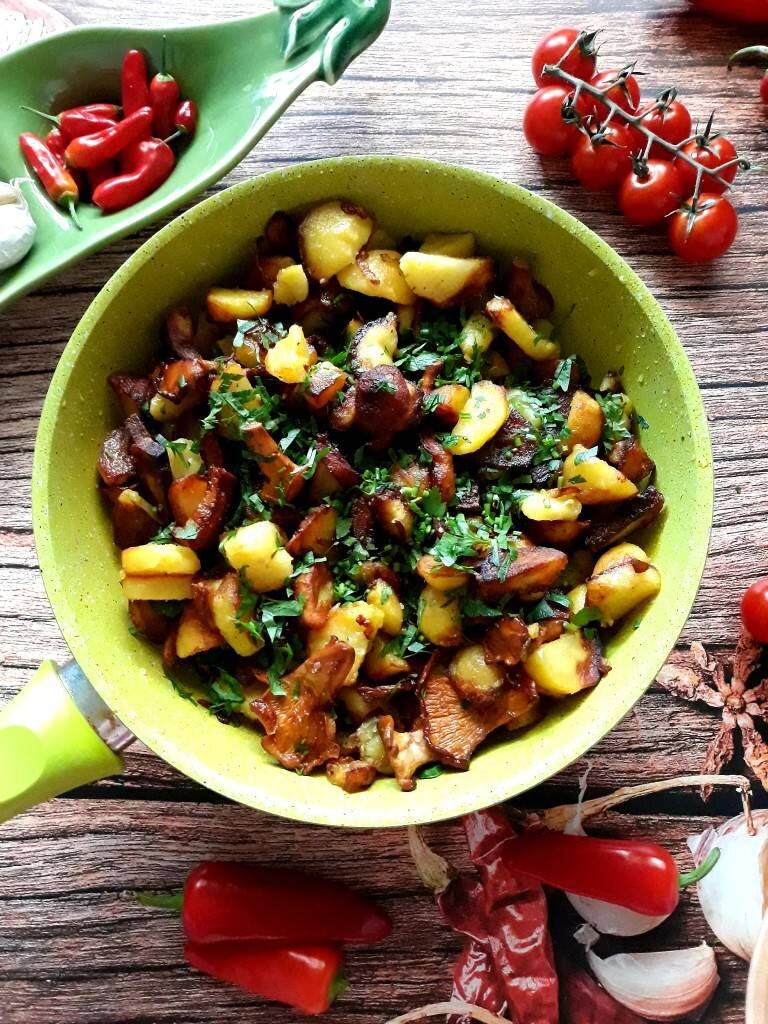 Наконец-то в лесу пошли лисички и черника! 🍄🧅🥔🌱 = 🥘🍞 #июль #вкусно #пятница #летнееменю #лисички #второе #обед #ужин #моякухня Ингредиенты: лисичек 🍄, картофеля 🥔, луковица 🧅, Соль 🍙, Любимые травы (у меня прованские) 🌱, Растительное масло для жарки 🏺 Способ приготовления: Грибы 🍄 почистить, вымыть. Лук 🧅нарезать тонкими полукольцами. Картофель 🥔 почистить, нарезать. Лук 🧅пассеровать на хорошо разогретой сковороде до прозрачности. Добавить лисички 🍄 Обжарить, чтобы выпарилась жидкость и грибы 🍄 зарумянились. Снять лисички 🍄 с луком 🧅 со сковороды, в сковороду выложить картофель 🥔 и поджарить до готовности. Добавить к картофелю 🥔 лисички 🍄 с луком 🧅, посолить 🍙, добавить любимые травы 🌱 и перемешать. Приятного аппетита! 🍄🧅🥔🌱🍙 = 🥘🍞
