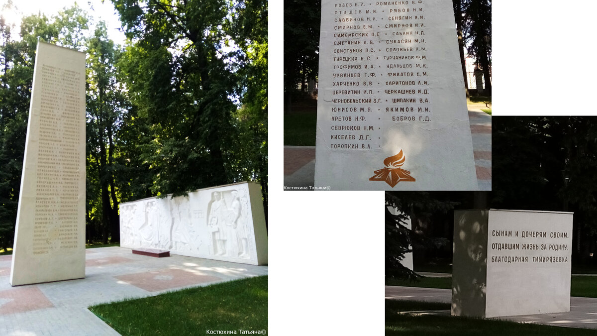 Раньше мне бы в голову не пришло фотографировать подобные памятники. Вроде бы зачем - они и так у всех на виду, и вряд ли содержат уникальную информацию. А потом я узнала о пропавшем без вести двоюродном деде и попробовала найти хоть что-то. Так вот фотографий нужного мне мемориала в сети нет. Ну ладно я - теоретически, я могу съездить в Подмосковье и сама. А как быть тем, кто живёт в других городах? На форуме ВГД в разделе, посвященном 1939-1945 гг., есть раздел "Фотографии": https://forum.vgd.ru/102/ Здесь выкладывают фото братских захоронений, воинских мемориалов и кладбищ, а также фотографии разыскиваемых, неопознанных сослуживцев из семейных фотоальбомов и репортажи с мероприятий, согласно территориальному делению. На моих фото - мемориал тимирязевцам, павшим на фронтах ВОВ в парке Московской сельскохозяйственной академии имени К.А. Тимирязева. В интернете пишут что памятник установлен в 1965 году. Один из первых военных мемориалов в Москве (?) Более 1000 тимирязевцев ушло на войн