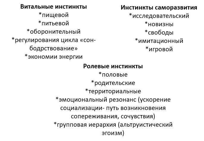 «Как ты можешь не хотеть детей, где твой материнский инстинкт!» «Я туда не пойду, у меня же есть инстинкт самосохранения» «Мне нужен кто-то, я же не могу пойти против инстинкта размножения» И тд и тп, такие фразы часто можно слышать вокруг, а идея инстинктов очень популярна в искусстве. А знали ли вы, что у человека инстинктов нет вообще!? Что ж, давайте разбираться. В первую очередь, что такое инстинкт. Инстинкт – это первичная реакция без специального знания на определенный стимул. Это более сложная форма нейро-мускулярного ответа на внешнюю среду, чем рефлекс, необходимая для выживания, в основном представленная у животных. Т.е. для выполнения инстинктивного действия не нужно включать мозг, чтобы не терять время! У животных их можно разделить на 4 группы: Однако в русскоязычной литературе можно встретить классификации человеческих инстинктов Как мы видим, большинство описанных инстинктов – результат сознательной деятельности, что противоречит определению инстинкта. Согласно современ