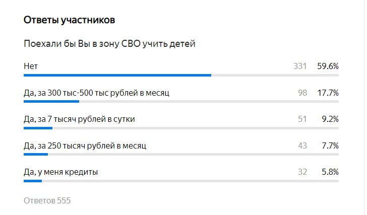 10 дней назад я сделал публикацию об учителях специального назначения - добровольцах направляющихся на освобождённые территории от нациков на украине: Там я сделал опрос, поехали бы вы будучи учителем туда. Ведь обещают и обычную зарплату плюс командировочные в 7-8 тысяч рублей в сутки. На сегодняшний день опрос прошли 555 человек, вот результаты: Как видим 40 % опрошенных поехали бы туда. Им деваться некуда - денег нет, а тут есть возможность немного подправить своё финансовое положение. Так вот, чиновники ответственные за сбор данных об этих добровольцах уже слили данные этих людей. Об этом написал депутат Александр Хинштейн, тот -который- раньше рьяно топил за цифровизацию всего и вся (да и сейчас небось тоже) Лишний раз убеждаешься, что главные предатели сидят именно в чиновничьих кабинетах и скорее всего министерства просвещения. Ведь проще всего данные вытащить именно оттуда. Дефективный менеджеры - главные враги нашего государства. Данные ушли некоему "Альянсу учителей", а оттуд