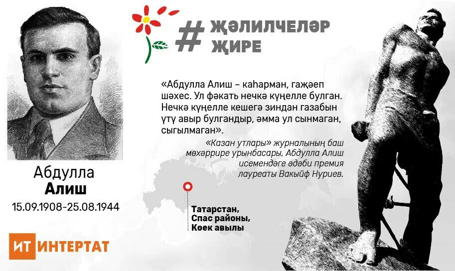 Абдулла Алиш (Габдуллазян Габдулбариевич Алишев) – татарский поэт, писатель, автор книг для детей, драматических произведений. Один из лидеров подпольной антифашистской организации джалиловцев в 1942-1944 годах. Родился 15 сентября 1908 года в селе Көек (Каюки) Спасского уезда Казанской губернии (Спасский район РТ). Учился в медресе села Ямбухтино. В 1927 году поступил в Казанский землеустроительный техникум. В 1933 году был назначен ответственным секретарем журнала «Техника» на татарском языке. С 1937 года до начала войны был литературным редактором в редакции журнала «Пионер каләме» (сейчас – «Ялкын») и Татарском радиокомитете.