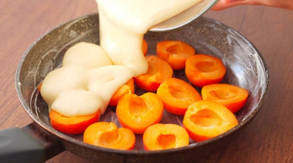 Заливаем фрукты тестом. Накрываем сковороду крышкой и жар
