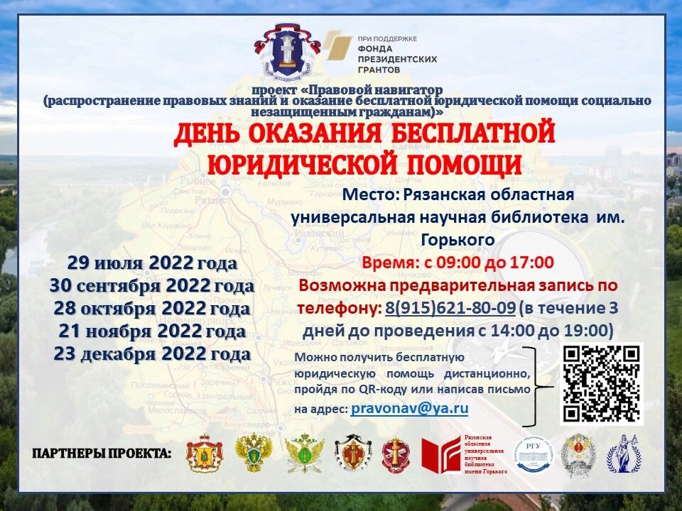 29 июля в Рязани пройдёт День оказания бесплатной юридической помощи. Граждан будут принимать в Рязанской областной универсальной научной библиотеке имени Горького на ул. Ленина, д. 52, по расписанию: 09:00-11:00 — ГБУ РО «Центр государственной оценки», — член Рязанского отделения АЮР Челнаков Дмитрий Сергеевич, — УМВД России по Рязанской области, — ФССП по Рязанской области. 11:00-13:00 — Адвокатская палата Рязанской области, — Рязанской областная нотариальная палата, — Управление Росреестра по Рязанской области. 13:00-15:00 — Министерство труда и социальной защиты населения Рязанской области, — Филиал ФГБУ «Федеральная Кадастровая Палата Росреестра» по Рязанской области, — АНО АРС «Рязанский центр медиации и права». 15:00-17:00 — Прокуратура Рязанской области, — Государственная инспекция труда в Рязанской области, — член Рязанского отделения АЮР Епифанов Дмитрий Юрьевич. Справки по телефону 8 (915) 621-80-09. Заранее записываться на приём необязательно, – сообщили в Ассоциации юристо