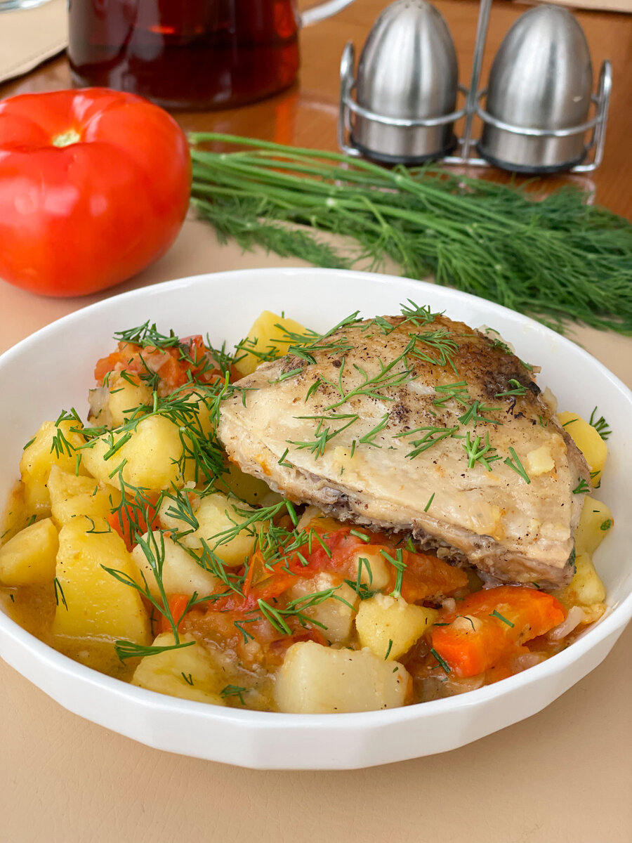 Люблю я такие рецепты, чтоб быстро, вкусно, просто и в одной кастрюле! Количество ингредиентов не прописываю, можно варьировать на свой вкус и размер посуды. Также можно разнообразить рецепт, например, добавить кабачок, болгарский перец или цветную капусту, а вместо бёдер приготовить куриные голени или филе. Ингредиенты: Куриные бёдра посолить, поперчить и обжарить на растительном масле с двух сторон до румяной корочки. Выложить на тарелку. На этом же растительном масле обжарить нарезанный картофель до золотистого цвета. Добавить нарезанные лук и морковь, слегка обжарить. Добавить помидоры, посолить, поперчить, перемешать. Влить немного воды (примерно полстакана, ещё помидоры дадут сок). Сверху выложить куски курицы, накрыть крышкой и тушить около 20 минут. В конце добавить измельчённый чеснок и зелень. Приятного аппетита! 😋 Ниже рецепт в видеоформате)