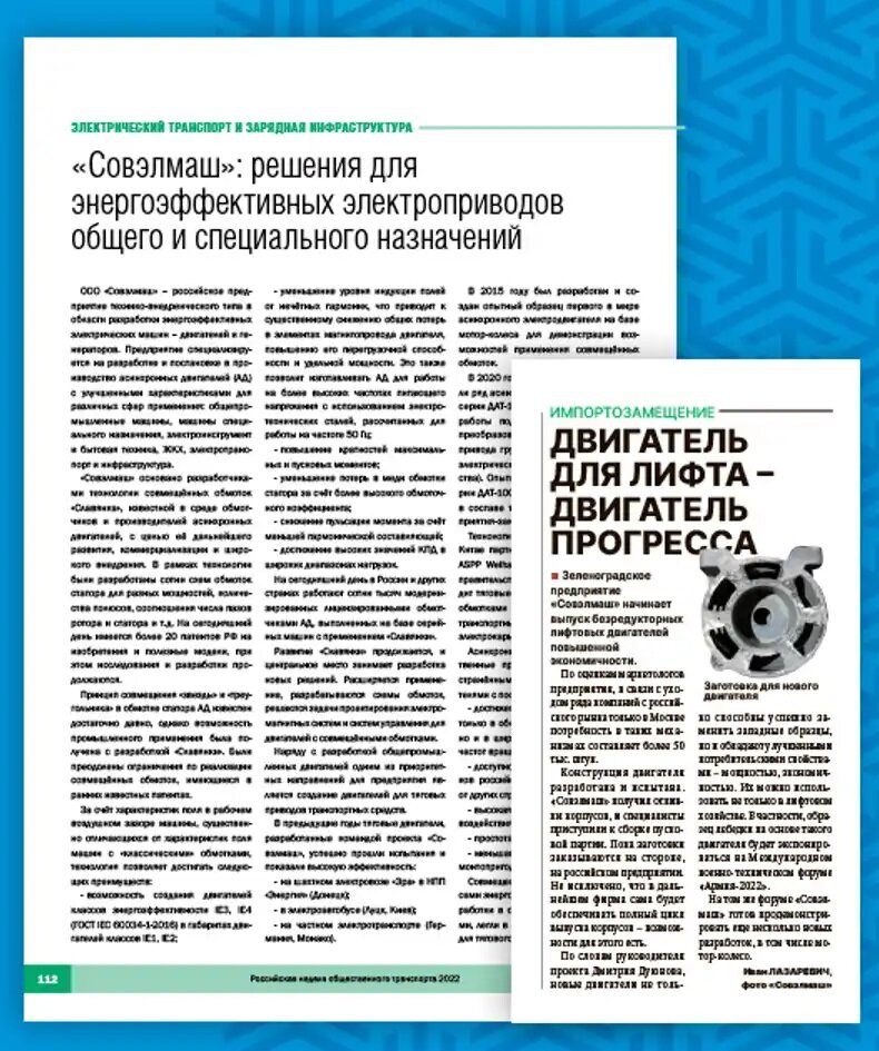 Статья «Совэлмаш»: решения для энергоэффективных электроприводов общего и специального назначений» опубликована в новом отраслевом информационном сборнике «Российский общественный транспорт». Этот сборник ежегодно выпускают организаторы Российской недели общественного транспорта, в рамках которой проходит выставка «ЭлектроТранс». Выставка состоится в сентябре в Москве, в ней примет участие компания «Совэлмаш». В статье подробно рассказывается о преимуществах технологии «Славянка», применении технологии на транспорте, инновационных разработках «Совэлмаш» и услугах будущего инжинирингового центра. С ней можно ознакомиться по ссылке. «Двигатель для лифта — двигатель прогресса»: под таким названием вышла ещё одна публикация о «Совэлмаш» в зеленоградской газете «41» (№23 от 15 июля от 2022 года). Она посвящена началу выпуска компанией «Совэлмаш» безредукторных лифтовых двигателей повышенной экономичности. В статье отмечено, что «новые двигатели не только способны успешно заменить западные о