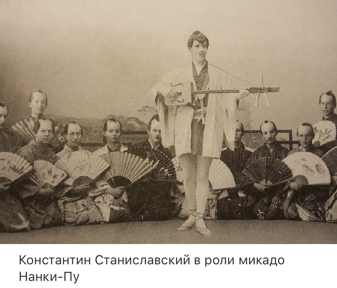 Костя Алексеев обожал постановки, подготовленные мужем его двоюродной сестры - Саввой Мамонтовым. Они были очень красивы и прекрасно раскрывали содержание спектакля. Савва Мамонтов говорил: « плохо, когда уши радуются, а глаза скорбят». Декорации его домашних постановок писали такие знаменитые художники, как Врубель, Поленов, Серов. Поэтому, когда молодой Костя Алексеев решил впервые поставить модную тогда английскую оперетку «Микадо» , он подошел обстоятельно и реалистично: сестры отправились в Гостиный двор и Пассаж Джамгаровых на Кузнецкий мост за кимоно и веерами (В 1887 году уже продавалось все, но было очень дорого!), а сам Константин Сергеевич отправился в цирк и привёз домой японских циркачей, чтобы рассказали и показали как правильно нужно кланяться и двигаться. Дом на некоторое время превратился в «маленькую Японию». Дом фабрикантов Алексеевых в Москве находился между Таганкой и Котельниками - примечательно, что в этом старинном дворце ещё Дайкокуя Кодаю в екатерининские вр