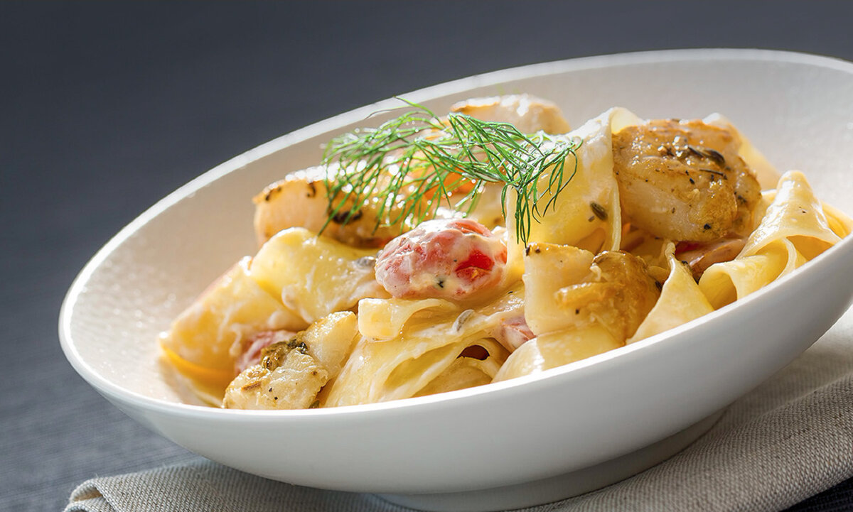 В преддверии выходных очень хочется побаловать себя и близких чем-то особенным. В «Табрис» вы всегда найдете множество идей для гастрономических открытий. И вот один из вариантов. «Гнезда» с морским гребешком На 6 порций понадобится следующие ингредиенты: Паста «гнезда» от «Гранд Мер» 400 г; Гребешки морские (свежие или замороженные) 400 г; Чеснок 3 зубчика; Масло сливочное 75 г; Укроп, петрушка по вкусу; Соль, перец черный молотый по вкусу. Приготовление: Паста «Гранд Мер» позволяет экспериментировать с самыми разными рецептами. При этом она хороша сама по себе и будет удивительно вкусна, если отварить ее и подать просто с маслом. Этот рецепт пасты - любимый у директора «Гранд Мер» - Филипе Хеймбургера. 2. Масло растопить, остудить до комнатной температуры. Смешать с мелко нарезанными петрушкой и чесноком. Посолить, поперчить. 3. Промокнуть размороженные морские гребешки бумажным полотенцем, чтобы убрать лишнюю влагу. На разогретую сковороду положить половину чесночного масла с петру