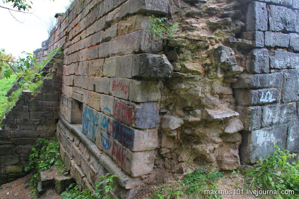 Следующий, более внушительный участок сохранившейся стены кремля находится с южной стороны холма. Его боковая сторона раскрывает технологию строительства крепостных стен, а она тогда была стандартной, что для кирпичных кремлей, что для каменных - между двух параллельных стен засыпали каменный бой, скрепляя его дополнительно раствором. Еще лучше это отображено на первом фото данного поста.