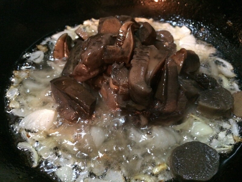 На сковороду нашинковали лук с грядки и поджарили до золотистого цвета.Добавили к луку отваренные подосиновики и немного прожарили.