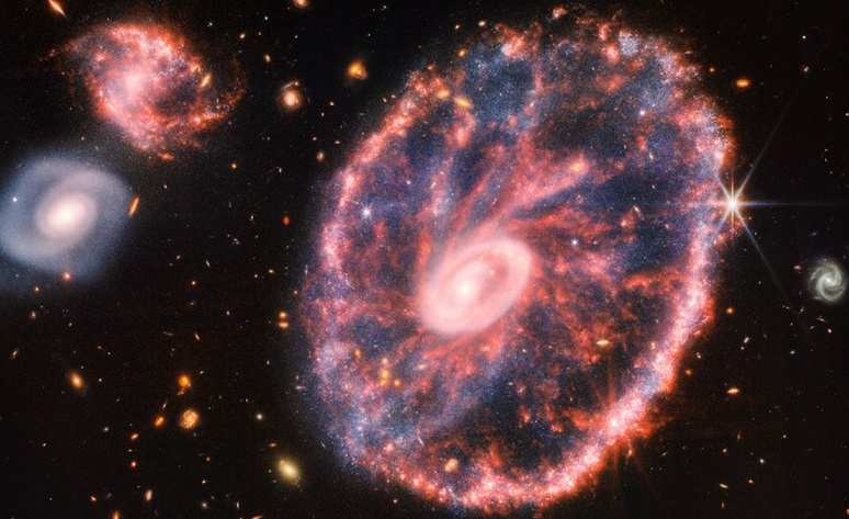 Это изображение было получено ранее прибором среднего инфракрасного диапазона телескопа Джеймс Уэбб (MIRI). На снимке видна группа галактик, в том числе большая искаженная кольцевидная галактика, известная как «Колесо телеги». «(MIRI) показывает области внутри галактики Колесо телеги, богатые уг