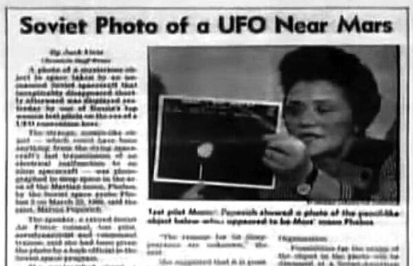 Из этого видеоролика, в котором ситуацию с «Фобосом-2» комментируют как советские, так и зарубежные специалисты, мы узнаем, что в декабре 1991 года советский летчик-космонавт Марина Попович побывала в США, где на пресс-конференции в Сан-Франциско продемонстрировала присутствующим фотографию, которая впоследствии стала знаменитой. Это было то самое фото неопознанного летающего объекта, находившегося вблиза спутника Марса – Фобоса. Фото, как видно по его маркировке, было сделано с помощью телевизионного комплекса «Фрегат», разработанного специалистами СССР, НРБ (Народной Республики Болгария) и ГДР (Германской Демократический Республики), 25 марта 1989 года, за одни сутки до того, как связь со спутником была утрачена.