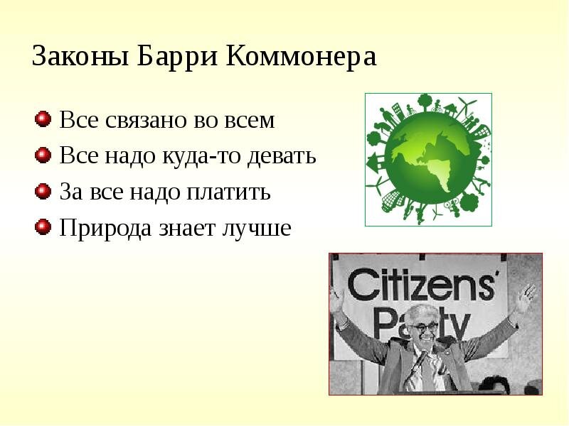 - Не существует такого понятия как "бесплатный обед". Эксплуатация природы неизбежно влечет за собой преобразование ресурсов из полезных в бесполезные формы.