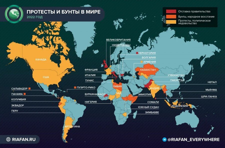 1. На заглавной карте обозначены страны, в которых с начала 2022 года прошли мощные протесты, восстания, перевороты или правительственные кризисы, которые привели к досрочным отставкам лидеров стран. Как видно, несмотря на многолетние мантры о том, что Россия шатается, и власть в ней вот-вот упадёт, на эту карту наша страна не попала.