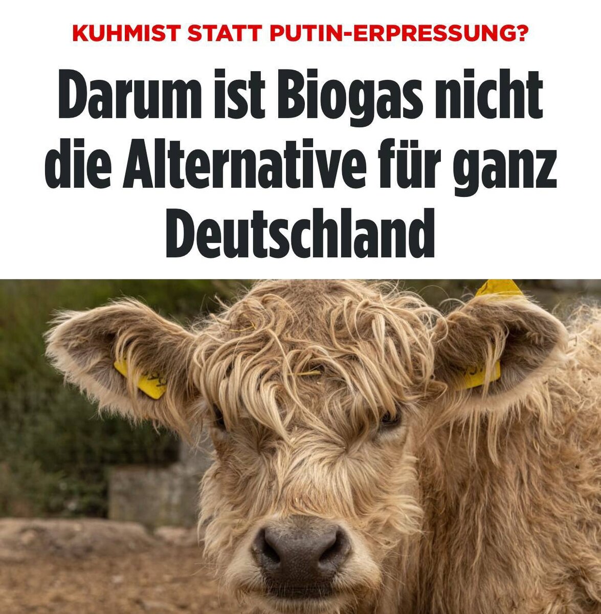 ⚡️⚡️«Коровьим навозом шантаж Путина не остановить. Биогаз не может стать альтернативой для всей Германии»: Bild предостерегает от головокружения от успехов после того, как несколько деревень смогли компенсировать отсутствие природного газа с помощью метана, добываемого из коровьего навоза и силоса. Как объясняет эксперт, «на всю Германию навоза не хватит, в больших городах эта схема не применима, а кроме отопления домов есть еще и промышленные предприятия, где нужны совсем другие объемы». Навозный -блицкриг провалился!!! 😭😭😭