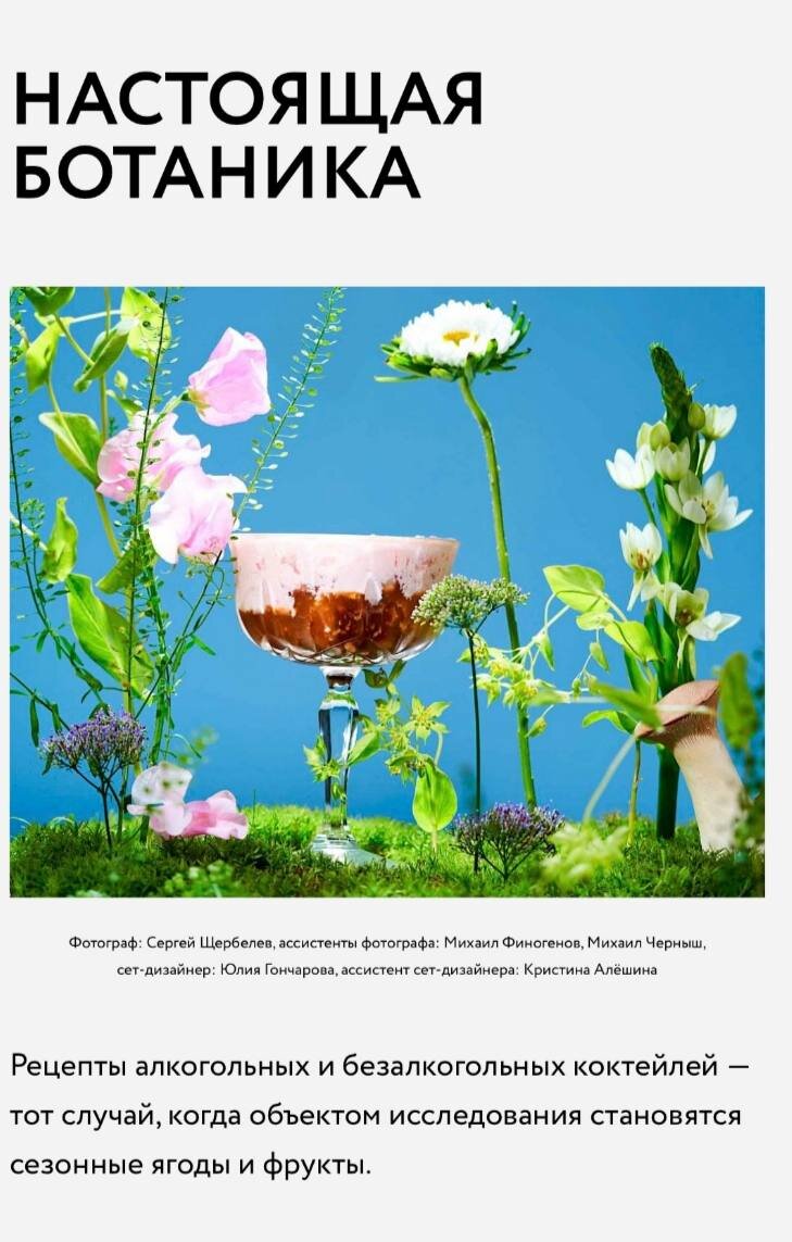 Рецепты алкогольных и безалкогольных коктейлей — тот случай, когда объектом исследования становятся сезонные ягоды и фрукты. Фотограф: Сергей Щербелев, ассистенты фотографа: Михаил Финогенов, Михаил Черныш, сет‑дизайнер: Юлия Гончарова, ассистент сет‑дизайнера: Кристина Алёшина Джингрия ИНГРЕДИЕНТЫ •100 г сезонных ягод •1 ст. л. сахара •25 г любых цитрусовых •40 мл розового джина •100 мл игристого вина •1 стакан льда в кубиках МЕТОД ПРИГОТОВЛЕНИЯ Взбейте блендером половину ягод с сахаром в пюре. Наполните бокал льдом. Добавьте ягодное пюре, выжмите сок из цитрусовых, сами цитрусовые нарежьте небольшими кубиками и тоже выложите в бокал. Влейте джин и перемешайте барной ложкой. Долейте бокал доверху игристым и ещё раз перемешайте. Влейте джин и перемешайте барной ложкой. Долейте бокал доверху игристым и ещё раз перемешайте. Ягодно-молочный ИНГРЕДИЕНТЫ •75 г мороженого •100 мл молока •50 мл любого ягодного сока •40 г взбитых сливок •50 г сезонных ягод МЕТОД ПРИГОТОВЛЕНИЯ Положите мороже