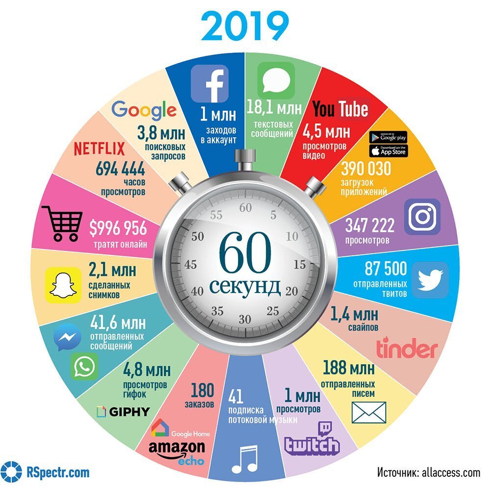 Каждую секунду в 2020 году среднестатистический пользователь создает 1,7 Мб информации. В одном только Facebook генерируется по 4 петабайта каждый день. Google выполняет более 40 тысяч поисковых запросов в секунду, а по всему миру люди каждую секунду отправляют друг другу почти 3 млн писем. Всего за прошлый год пользователи произвели 59 зеттабайт данных, или почти 670 трлн полнометражных фильмов. А к 2025 году этот показатель утроится.