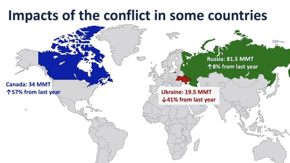 Производство пшеницы в Канаде в 2022/23 маркетинговом году составляет 34 млн тонн, что на 12,4 млн тонн (57%) больше, чем в прошлом году. Убранная площадь оценивается в 10 млн га, что на 8% больше, чем в прошлом году. На 57 процентов!!!