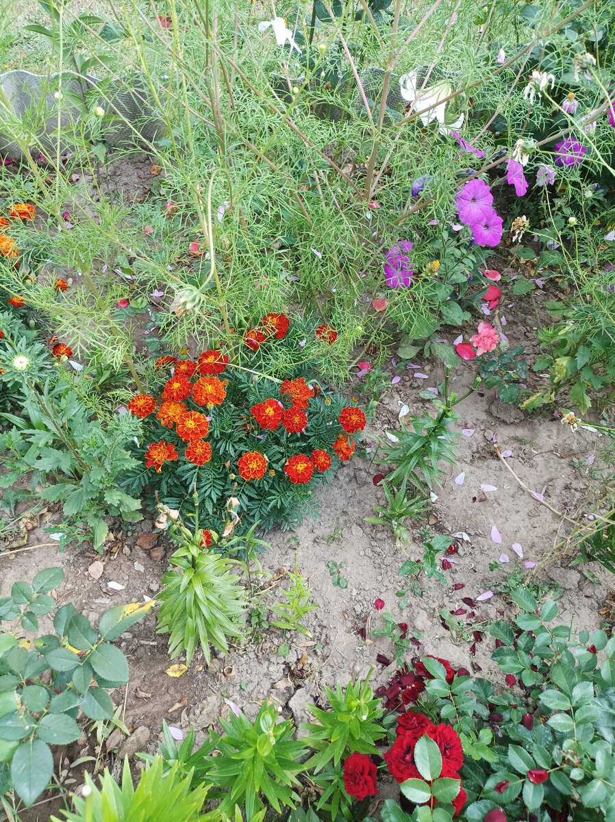 Розы и все остальные кусты и лианы прекрасны и хороши, но у меня много других цветов. В этом году как обычно сеяла бархатцы в на рассаду, а также некоторые сразу в грядки. Бархатцы сеяла два сорта, первые смесь на пакете было написано смесь Примо. В пакете было немного семян, наверное, штук 15 , а вышло 4. Пришлось ещё посеять, выбрала сорт Кармен. А в этом пакете штук 50 было, не все смогла распикировать и сохранить, но много осталось, не знала куда пристроить. Но с разъездами поздно высадила и долго разрастались и никак не могли зацвести. Но сейчас превратились в огромные кустищи. Годеция разрослась и расцвела пышными кустами. Годеция была тоже смесь, я предпочитаю смесь из разных расцветок. Петуньи люблю за то, что цветут всё лето. Предпочитаю тоже смесь, купила несколько сортов и смесь , и монохромные. Немного за петуньями не совсем хорошо ухаживаю, много ошибок допускаю в уходе. Вырастают не такие раскошные, как на фото в интернете, но за то цветут до осенних заморозков, ин