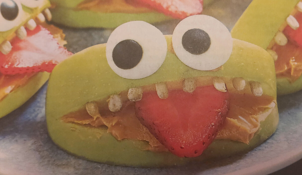"Яблочный пакман" Ингредиенты: 1. Яблоки зеленые - 4 шт 2. Вареная сгущенка - 2-3 ст.л 3. Клубника - несколько штучек 4. Семечки подсолнечника - 2 ст.л 5. Глазки - мармеладки Приготовление: Промойте клубнику, разрежьте ее на тонкие ломтики. Яблоки промойте и ошпарьте кипятком. Разрежьте их на 5 частей каждое и удалите косточки. С внешней части дольки отрежьте ножом маленькую дольку и в верхнюю часть воткните немного семечек, это будут "зубки". Нижнюю часть "рта" смажьте сгущенкой и выложьте по клубничке. Глазки приклейте с помощью сгущенки. Можно сбрызнуть лимонным соком. "Бутерброд с улыбкой" Ингредиенты: 1. Тостовый хлеб - 2 ломтика 2. Колбаса - 2 ломтика 3. Сливочное масло 4. Сыр - 2 ломтика 5. Свежий огурец - 1 шт 6. Маслины -2 шт Приготовление: Нарежьте сыр на полоски. Маслины разрежьте пополам. Овощи помойте, отрежьте у огурца 4 кружка. Помидоры нарежьте дольками, хлеб поджарьте и смажьте немного маслом. Разрежьте на треугольники. На 2 треугольника положьте по колбасе, а сверх