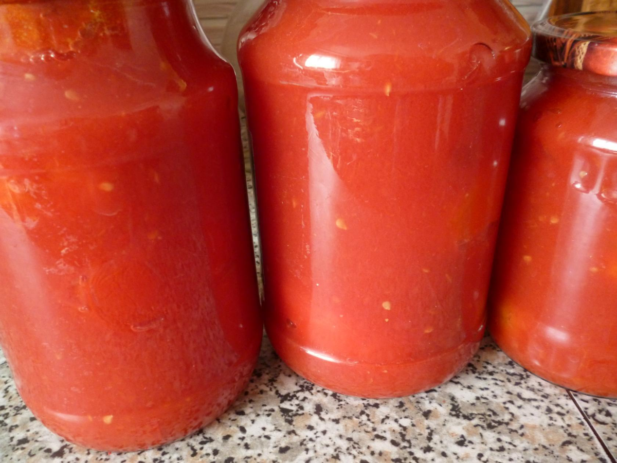 Более мягкие и крупные томаты ошпариваем на 2-3 минуты кипятком, помещаем под холодную воду, удаляем с них кожицу и измельчаем любым способом.Замеряем количество сока и сравниваем с количеством воды. Убавляем или добавляем сока. На 5 литровых банок у меня ушло 3 литра сока.