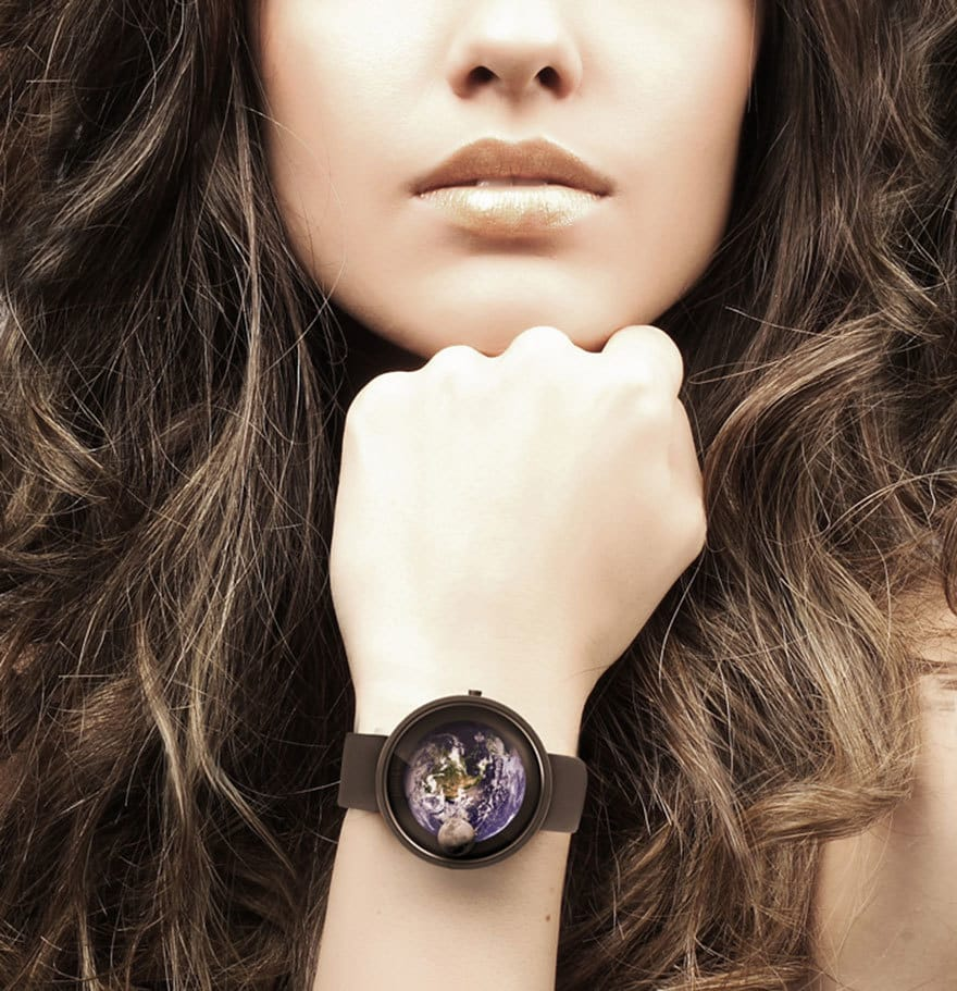 В настоящее время никого не удивишь циферблатом наручных часов, который украшен драгоценными камнями или оснащен инновационными механизмами типа хронографа. Интересным трендом 21 века стали экземпляры без стрелок и цифр, открывающие дизайнерам поле для фантазии. В этой статье представлены несколько моделей от именитых брендов. Earth and moon watch Стиль необычайно красивой модели придуман дизайнером из России Александром Сорокиным. Концепт часов полностью отражен в их названии. На циферблате изображена Земля с ее спутником. Именно Луна замещает стрелки. Ее изображение вращается по орбите, показывая собой часы, а тенью – минуты. Величина затененной площади Земли отражает количество последних от начала часа. Модель оснащена модулем GPS, который обеспечивает ей синхронизацию по спутнику. На циферблате отражено время суток, соответствующее местоположению человека на Земле. Аксессуар оснащен двумя вариантами подсветки. Смена последних происходит с учетом времени дня. Корпус выполнен из ст