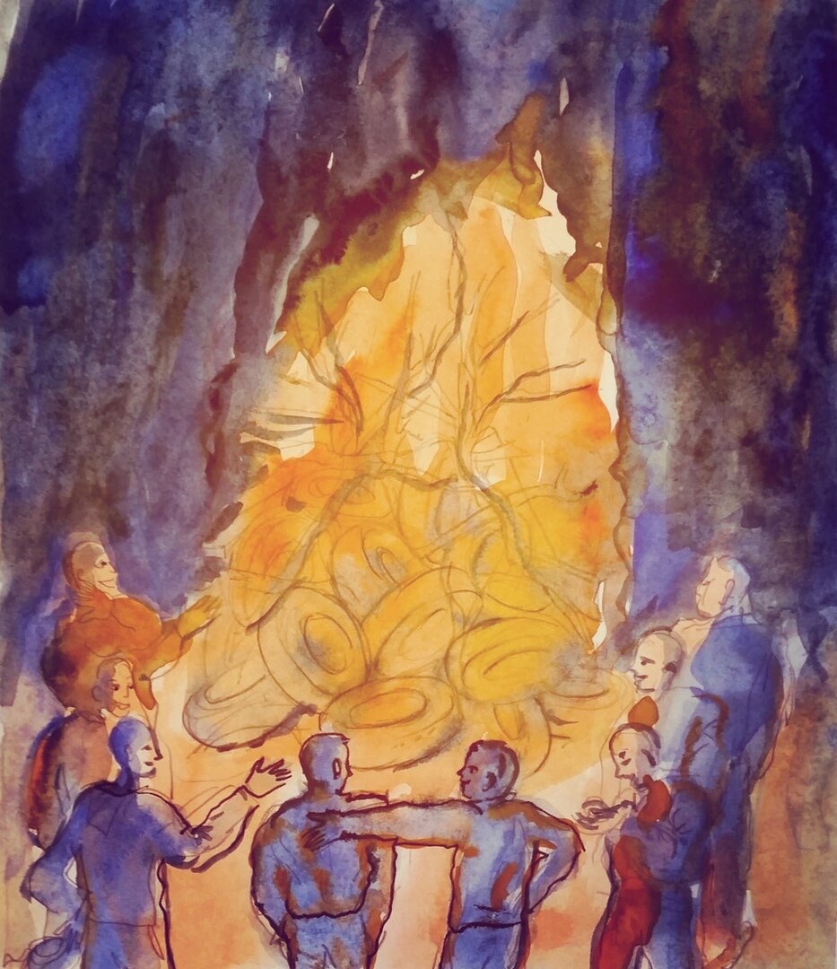 Наконец бочку разорвало, разгорелся солидол и покрышки. Столб пламени и дыма был фантастической высоты. Как старик Хотабыч. Странно, ветра не было, почти штиль. Мы потихоньку выпивали и закусывали. Беседовали о жизни, вспоминали былое и строили планы. Тихо, но слышен был какой-то далекий гул с меняющейся тональностью и модуляцией какими-то призвуками, может подводной лодки или корабля. Это была странная музыка.