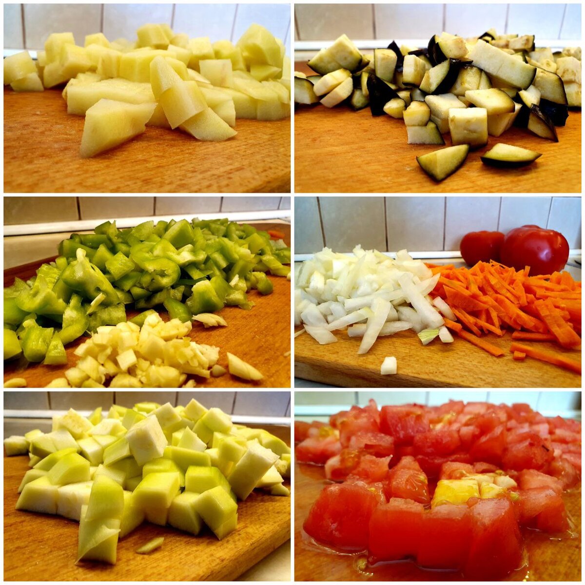 Ингредиенты: -1 этап: Готовим ингредиенты для нашего рагу. Овощи помыть. Баклажан нарезать кольцами, отправить в чашку, посолить и перемешать. Пока мы готовим остальные компоненты, баклажан отдыхает и прощается с горечью. Чистим кабачок, лук, морковь, чеснок и картофель. Нарезаем кубиками кабачок и картофель. Мелко шинкуем лук. Морковь- соломкой. Чеснок я мелко-мелко режу, можно натереть или использовать чеснокодавку. Кому как нравится. -2 этап: Как только овощи готовы, начинаем их обжаривать на сковороде с добавлением растительного масла по отдельности по 5 -7 минут на среднем огне. По мере обжарки, складываем всё в кастрюлю с толстым дном. -3 этап: Пока овощи жарятся, баклажан отдыхает, мы снимаем кожицу с помидорок (с помощью кипятка) и нарезаем кубиками. -4 этап: Баклажан, спустя 15 минут отдыха, промыть под холодной водой, обсушить при помощи бумажного полотенца и нарезать кубиками. Также, как и все остальные овощи, обжариваем его на сковороде и перекладываем в кастрюлю к др