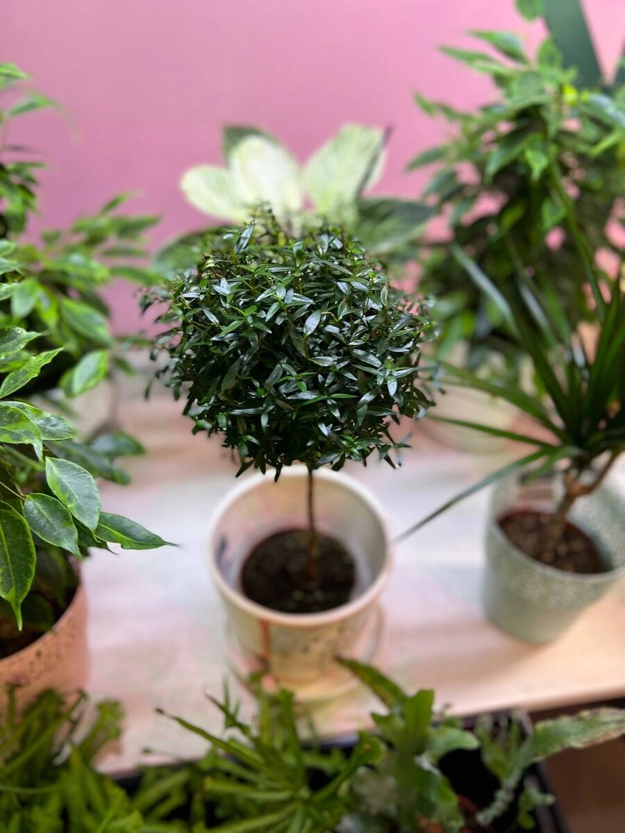 Мирт довольно неприхотливое растение. Мелкие яйцевидные листья у мирта блестящие и обладают приятным ароматом, летом на нем появляется очень много белых цветов. Мирт требует декоративной обрезки, т.к. если его необрезать он довольно быстро начнет разрастаться в ширину и высоту до 60 см.