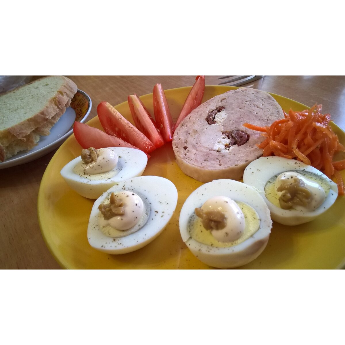 Полагаю что именно этот девиз больше всего подходит к всеми любимым фаршированным яйцам. Практически ни один праздничный стол без них не обходится. И со стола одними из первых исчезают - ну после оливье конечно! А экспериментировать с приготовлением одно удовольствие! С чесночком и с грибами, с зеленью и с рыбкой, с мясом и паштетом! Украшение вообще отдельный ритуал! На одно веточку петрушки, на другое - укропчика, пару горошинок или кукурузки, а может дольку маслинки или лимончика! Красота! Для праздничного стола припасла вам несколько рецептиков для разнообразия. Яйца, фаршированные ветчиной