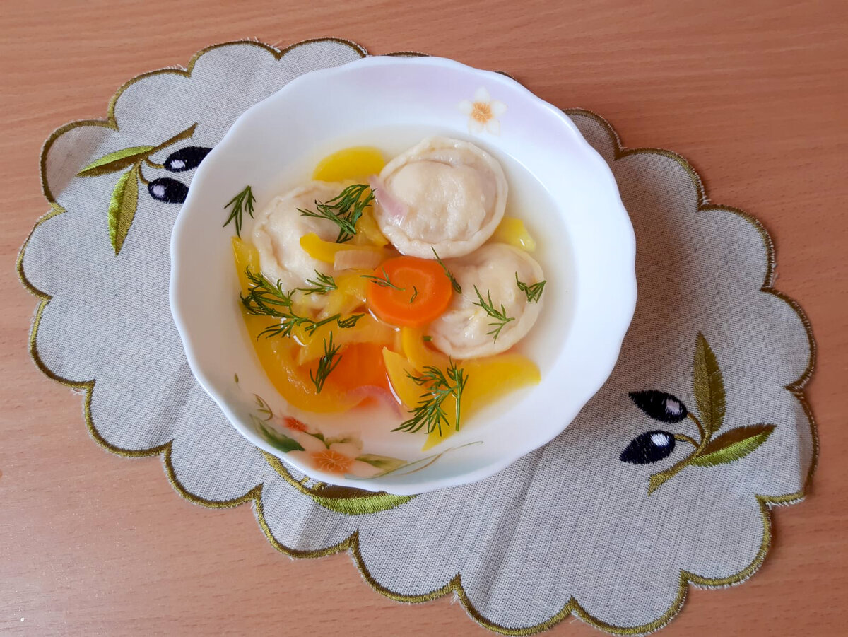Тесто: Молоко – 200 мл Яйцо – 1 шт. Масло растительное – 1 столовая ложка Соль – ½ чайной ложки (примерно) Мука – 1, 5 - 2 стакана (сколько «возьмёт» тесто) Фарш: Рыбное филе (желательно кета, но можно и другие виды рыбы) – 250 – 300г Лук – 1 головка Чеснок – 1 зубчик Паприка молотая – ½ чайной ложки Соль, сахар, перец – по вкусу Лимонный сок – несколько капель Бульон: Вода – 2 л Лук репчатый – ½ головки Морковь – 1 шт. (не очень крупная) Чеснок – 1-2 зубчика Перец чёрный (горошек) – по вкусу Лавровый лист – 2-3 листочка Зелень – петрушка, укроп, кинза (по вашему вкусу) Соль – по вкусу Сливочное масло – 1 чайная ложка Приготовление: 1. В глубокую миску высыпать муку. Добавить соль. Перемешать. Сделать лунку посередине. 2. Яйцо взбить вместе с молоком, постепенно влить в муку. 3. Добавить в тесто растительное масло. Замесить крутое тесто. 4. Тесто накрыть пищевой плёнкой и приступить к приготовлению фарша. 5. Рыбу почистить, отделить от костей, сбрызнуть лимонным соком. 6. В мясорубке и