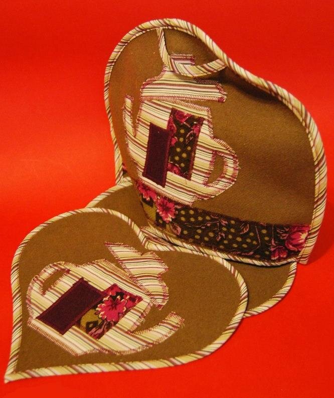 Внутри прихваток использовала старые толстые трикотажные или вязаные вещи. Верхнюю часть собирала из хлопчатобумажных лоскутов, хотя некоторые из обрезков тонких шерстяных тканей.