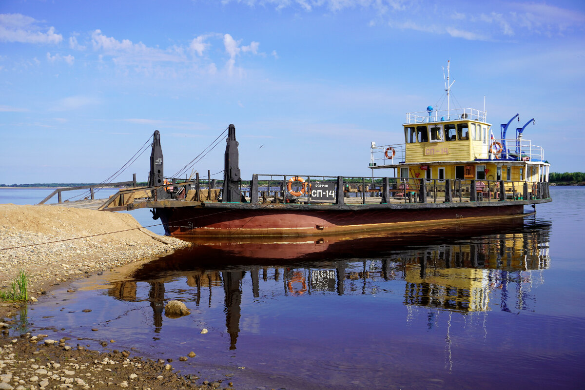 Приветствую, друзья! Путешествуя по России, а именно по захолустным местам, зачастую случается так, что дорожное полотно обрывается об берег реки. Как ехать дальше?! Решение есть, воспользоваться паромной переправой. Почём нынче услуги перевозчиков, расскажу исходя из собственного примера. Перед нами самоходный паром СП-14, он осуществляет перевозку пассажиров и транспортных средств по маршруту Красноборск-Дябрино-Красноборск, протяженность речного пути, в одну сторону, около 5 км. По течению реки, от точки "А" до точки "Б" паром добирается за 15 минут, в обратную сторону уходит час, где время пути напрямую зависит от загруженности парома. Кстати, грузоподъемность СП-14 составляет 61 тонна, а на его платформе могут разместиться около 12 легковых автомобилей. Пассажиры обилечиваются в кассе самостоятельно, а вот к водителям транспортных средств кондуктор подойдёт сам. Теперь ловите лайфхак, как проехать пассажиром на пароме, не обилечиваясь, при этом не нарушив закон. Попроситесь кому-