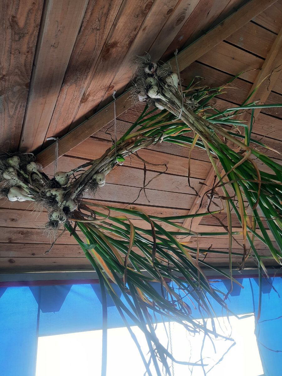 2) Чеснок наконец-то выпрямил стрелку и настало время его убирать на сушку. Урожай можно считать одним из худших за весь мой опыт огородничества. Думаю, это связано с жарой и засухой.