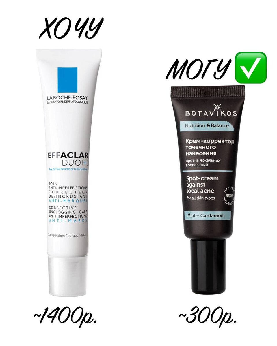С вами постоянная рубрика Хочу-Могу. Сейчас важно не только находить отечественные аналоги любимых средств, но и экономить кровно заработанные, когда это возможно🌝 Сегодня мы с вами одним постом поймаем сразу двух зайцев Пару лет назад я уже находила бюджетный аналог крему La Roche Posay Effaclar duo (+), это был крем Librederm Серацин Но на днях я нашла ещё один вариант, которым не могу не поделиться с вами, давайте посмотрим вместе La Roche-Posay Effaclar Duo(+) Крем-гель корректирующий ~1400р 🌿В составе соединения цинка, ниацинамид, салициловая кислота и антибактериальные компоненты В аналоги я предлагаю Botavikos Крем-корректор для точечного нанесения Nutrition & Balance ~300p 🌿В составе те же соединения цинка, салициловая кислота и много эфирных масел, которые окажут антибактериальный эффект Средства очень похожи, наносить их лучше точечно на воспаления, я предпочитаю это делать на ночь Рекомендую попробовать бюджетный аналог от botavikos, но имейте в виду, что эфирные масла м