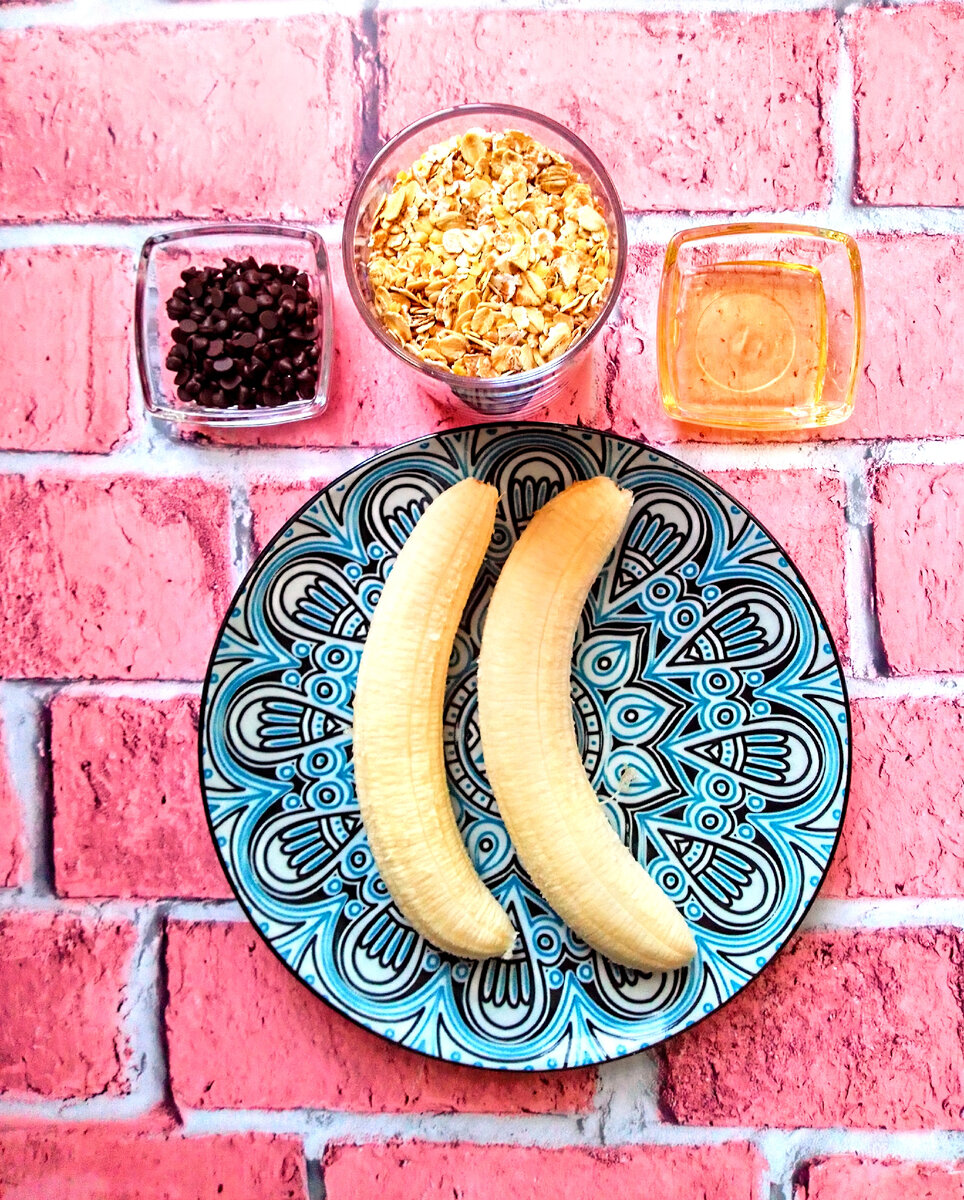 Ингредиенты: - Банан 2шт - Хлопья 5 злаков 1 стакан (100г) - Шоколадные капли 20г - Мед 50г - Масло растительное 1ч.л. 1) Бананы почистить и размять в пюре. Можно измельчить в блендере. 2) Измельчённые бананы смешиваем с хлопьями, шоколадными каплями, медом и маслом. 3) Противень застелить пергаментом и выложить плотным слоем смесь. 4) Ставим в разогретую до 170° духовку на 20 минут. 5) Достаем, охлаждаем и нарезаем на кусочки. 6) Наслаждаемся вкусным и сытным перекусом.