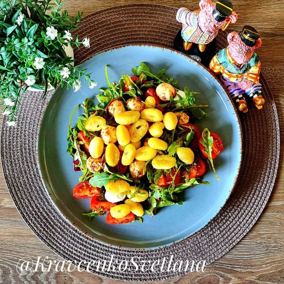 #июль #понедельник Быстрый и очень вкусный 15-минутный салат с ньокки, идеальный рецепт для летних дней. Жареные ньокки - снаружи хрустящие, а внутри мягкие и чуть упругие. Ингредиенты: картофельные ньокки (готовые), салатный микс, руккола, томаты черри, моцарелла мини, для заправки, соус песто с вялеными томатами (если такого нет, добавьте вяленые томаты отдельно), бальзамический уксус, вода, чесночный порошок, соль, перец - я не добавляла Способ приготовления: Подготовьте необходимые продукты. Обжарьте ньокки до румяного цвета, посолите по вкусу. Выложите на блюдо салатный микс и рукколу. Черри разрежьте пополам или на четвертинки. Добавьте шарики моцареллы. Для заправки смешайте соус песто с бальзамическим уксусом, водой и специями. Добавьте заправку, перемешайте. Лучше всего положите ньокки сверху в конце, чтобы они оставались красивыми и хрустящими. Приятного аппетита!