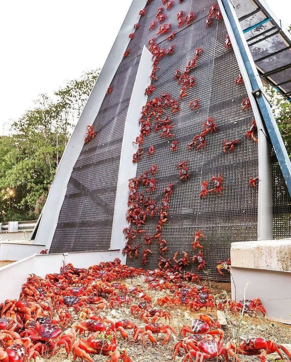 Остров Рождества — относительно небольшой (135 кв. км) остров вулканического происхождения в Индийском океане, принадлежащий Австралии. Главной достопримечательностью острова является ежегодная миграция 100 млн. красных крабов (Gecarcoidea natalis), во время брачного периода, происходящего примерно середины октября по январь, отправляющихся в многодневное путешествие из дождевых лесов к берегам океана, покрывая при этом оранжево-красным ковром все что попадается на пути: дороги, площадки, дворы, здания. Точно предсказать дату миграции сложно, все зависит от того, когда начнется влажный сезон. Для того чтобы добраться до берега крабам надо около 18 дней. Происходит одна из самых впечатляющих природных миграций – синхронного передвижения на несколько километров десятков миллионов крабов. Земляной красный краб – это вид ракообразных, который обитает только на острове Рождества. Фотографы и экологи со всего мира ежегодно съезжаются на это удивительное зрелище.