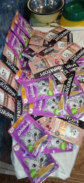 Светланы Владимировны Х. (300) "Хвостикам, куда нужнее" Валерии Борисовны Б. (200)"Маленьким пушистикам" Елены Владимировны П. (100) Марии Васильевны С. (500) "На корм" Благодарим сердечно за помощь 💖❤️💖. ✅Расход сегодня : 1160,15 руб.❗ Докупили влажные пакетики с кормом (неожиданное пополнение, часть корма отвезли на передержку вместе с кошечкой, которую вчера стерилизовали) и корм сухой для собак. Чек 750,16.руб. Чек 409,99 руб. Лидия.