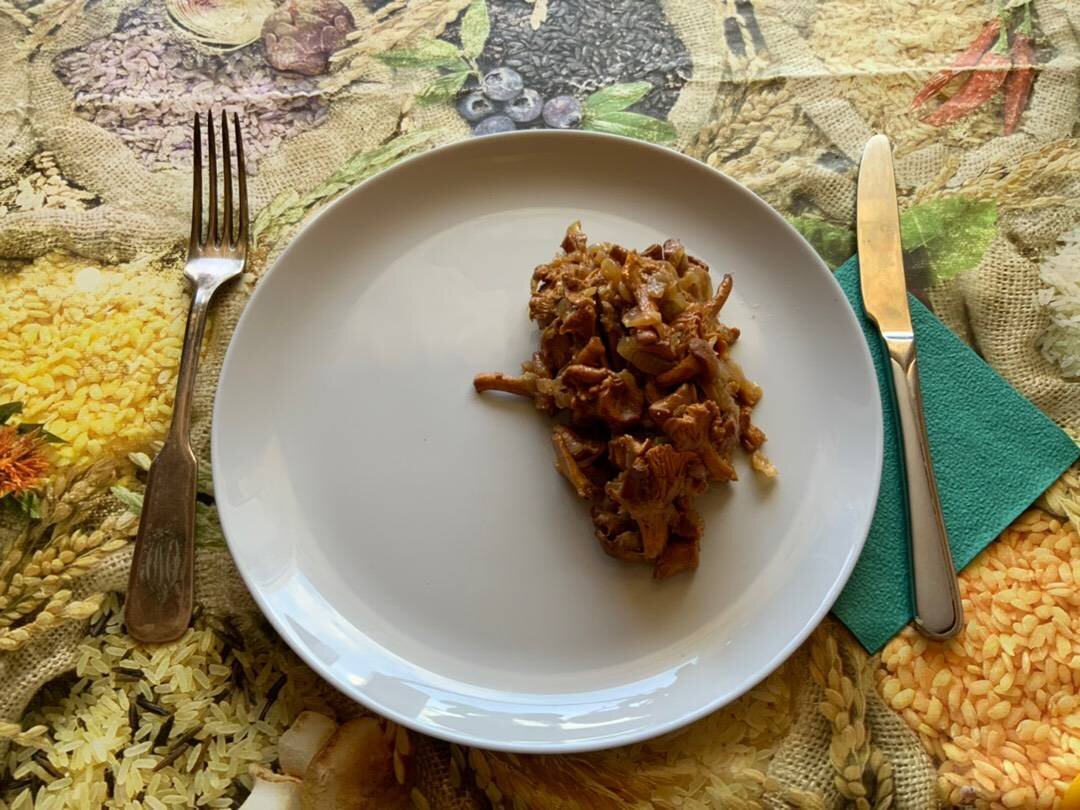 #июль Ингредиенты: лисичек, средних луковицы, любого постного масла без запаха для обжарки, соль Способ приготовления: Моем, чистим и сушим на дуршлаге грибы. У меня при чистке было найдено 4 ягоды черники бонусом)). Лук чистим и режем. Грибочки покрупнее режем пополам, мелкие оставляем целенькими)). При тщательной переборке было обнаружено ещё 7 бонусов)). На 2 ложках масла обжариваем лук до румяности. Добавляем грибы, солим и жарим до полного выпаривания жидкости. Вуаля! Подаём с жареной картошкой)).