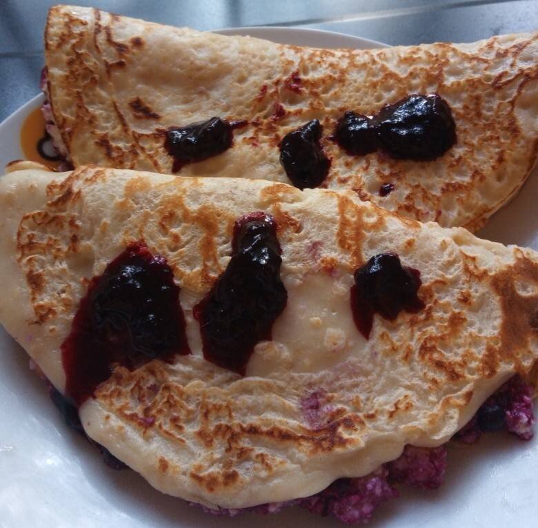 Сытный, с множеством начинок овсяноблин. Отличный завтрак или перекус. Самое главное, что готовится очень быстро 😊 #ягоды #июль Ингредиенты: Овсяные хлопья (быстрого приготовления) 1 уп 🌾, Яйцо🥚, Кефир 🥛, Кипяток 💧, Мука 🌾, Творог 🍚, Ягоды любые 🍒 Способ приготовления: Яйцо смешиваем с хлопьями. Добавляем кефир. Добавляем муку. Замешиваем тесто. Добавляем воду, перемешиваем. Выпекаем овсяноблин с двух сторон до румяной корочки. Творог смешиваем с ягодами и выкладываем начинку на блин. Слегка придавливаем, приятного аппетита 💋.