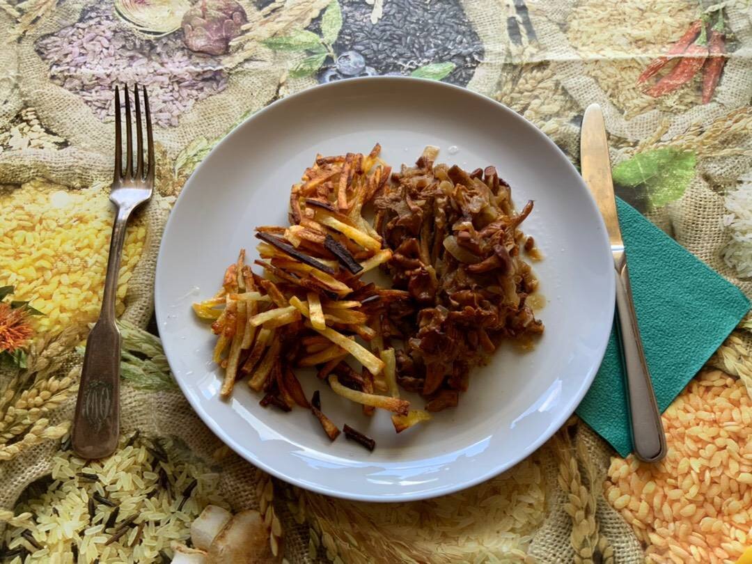 Картошка получается хрустящей! #июль Ингредиенты: небольшие картофелины, свиного сала (у меня-обрезки на шкуре), соль , жареные лисички с луком - на подачу Способ приготовления: Картофель чистим, моем и режем. Вся суть моего рецепта в нарезке. Я режу как можно тоньше, чтобы картофельная соломка была максимально мелкой. Сало режем небольшими кусочками вместе со шкурой. Отправляем на сковородку и под крышкой вытапливаем жир. Сала у меня было много (600 гр.) поэтому после того как жир вытопился, выбрасываем шкварки, а большую часть топлёного жира дважды процеживаем, остужаем и убираем в холодильник в закрытой банке. На оставшейся жиру жарим промытую и подсушенную картошку в течение 15 мин на высоком огне без крышки (это важно!). Подсаливаем, аккуратно переворачиваем и обжариваем вторую сторону до румяности, примерно 10 мин, переворачивая слишком зажаристую. Вуаля! Подаём с жареными лисичками.