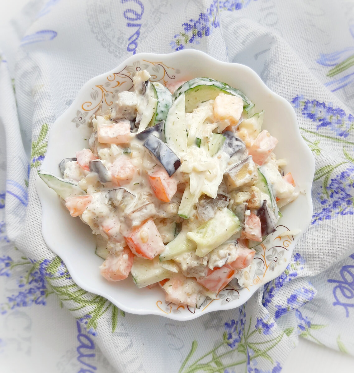 🌼КБЖУ на 100 г.: 74 ккал 4.3/4.5/3.6 Выход: 557 г. , 410.8 ккал. 🌼Ингредиенты: Баклажан - 1 шт.~ 250 г. Масло для жарки.(У меня топлёное - 7 г.) Помидор - 100 г. Огурец - 100 г. Сыр лёгкий - 60 г. Чеснок - 2 зубчика. Сметана 10% - 80 г. Соль, зелень. 🌼Приготовление: 1️⃣ Баклажаны нарезаем кубиками и обжариваем на масле до золотистой корочки. 2️⃣ Нарезаем соломкой огурцы, кубиками помидорки и натираем на тёрке сыр. 3️⃣ Смешиваем с остывшими баклажанами, выдавливаем чеснок, добавляем зелень и заправляем салатик сметанкой. Кушаем и наслаждаемся 😋 Вам также может понравится: #пп #ппсалат #ппбаклажаны #баклажанысалат #баклажаныссыром #баклажаныспомидорами #баклажаны #баклажанырецепт #ппбаклажанчики #ппрецепты