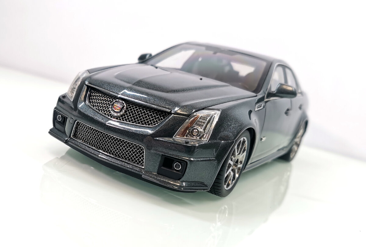 Производитель: G. C. D. Материал: металлический сплав (diecast) Год производства модели/оригинала: 2012/2009 Статус: мегараритет В 2008 году GM начали выпуск Cadillac CTS второго поколения, а годом позже появилась заряженная версия V, которая стала самым быстрым седаном в мире. Модель первоначально была выпущена под брендом Gain Corporation или GCD. Вообще, большинство дилерских Кадиллаков, таких как SRX II или CTS II coupe первоначально выходило именно под этим брендом, а позднее для продаж в Европе и США, модель выпускалась под более известным брендом Kyosho, но я приобрел именно вариант GCD, практически сразу после выхода модели в продажу. Модель выпущена в сером и черном цветах, причем встречаются версии как с темными, так и со светлыми салонами. Кадиллак отлично окрашен, часть шильдов выполнена отдельными деталями. Кроме стандартного, китайцы традиционно предлагают расширенный функционал, например, открывающуюся сдвижную панорамную крышу. Под капотом корветовский V8 объемом 6,2 л