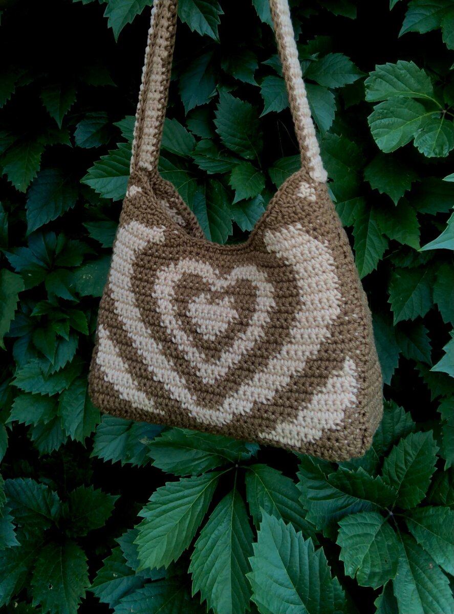 Небольшая, приятная и современная сумка. Когда увидела такую, сразу поняла какой расцветки я хочу ее сделать. Проблема была с схемой/рисунком, хотела с готовой сумки сама вывести рисунок, но мне повезло, спустя время, я нашла подобные сердца. Связала две отличные стороны (они с разным порядком цветов), решила, что не просто сошью их, а сделаю дно и бока, позже была готова и ручка. Не стала мудрить с ее узором. Очень милая сумка получилась. <3