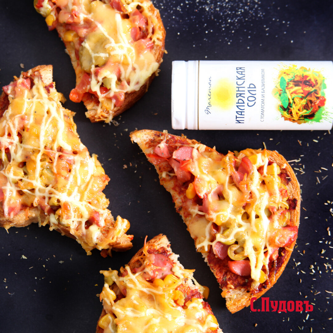 Рецепты быстрой пиццы одни из самых популярных. Готовить вкусную закуску по мотивам знаменитого итальянского блюдо – действительно, удобно. Времени уходит мало, а во вкусе те же ноты. Вот и наш вариант а ля-пиццы на скорую руку. Ингредиенты: Готовая хлебная смесь Средиземноморский хлеб с базиликом, орегано и красным перцем – 1 шт. Вода комнатной температуры – 260±10 мл Растительное масло – 1 ст. ложка Сосиски – 10 шт. Сыр – 150-200 г Оливки, кукуруза, помидор Майонез Томатная паста Базилик сушеный С.Пудовъ Итальянская соль Mareman Чеснок сушеный С.Пудовъ Приготовление: 1. Соедините в миске смесь, воду и растительное масло. Замесите однородное тесто. Переложите тесто в миску, смазанную растительным маслом. 2. Уберите миску с тестом в тёплое место на 1 час до увеличения в объёме в 2-2.5 раза. 3. Обомните тесто руками и выложите в форму, застеленную бумагой для выпечки. 4. Выпекайте хлеб в заранее разогретой до 180С духовке в течение 40-45 минут до готовности. 5. После выпечки оставьте хл