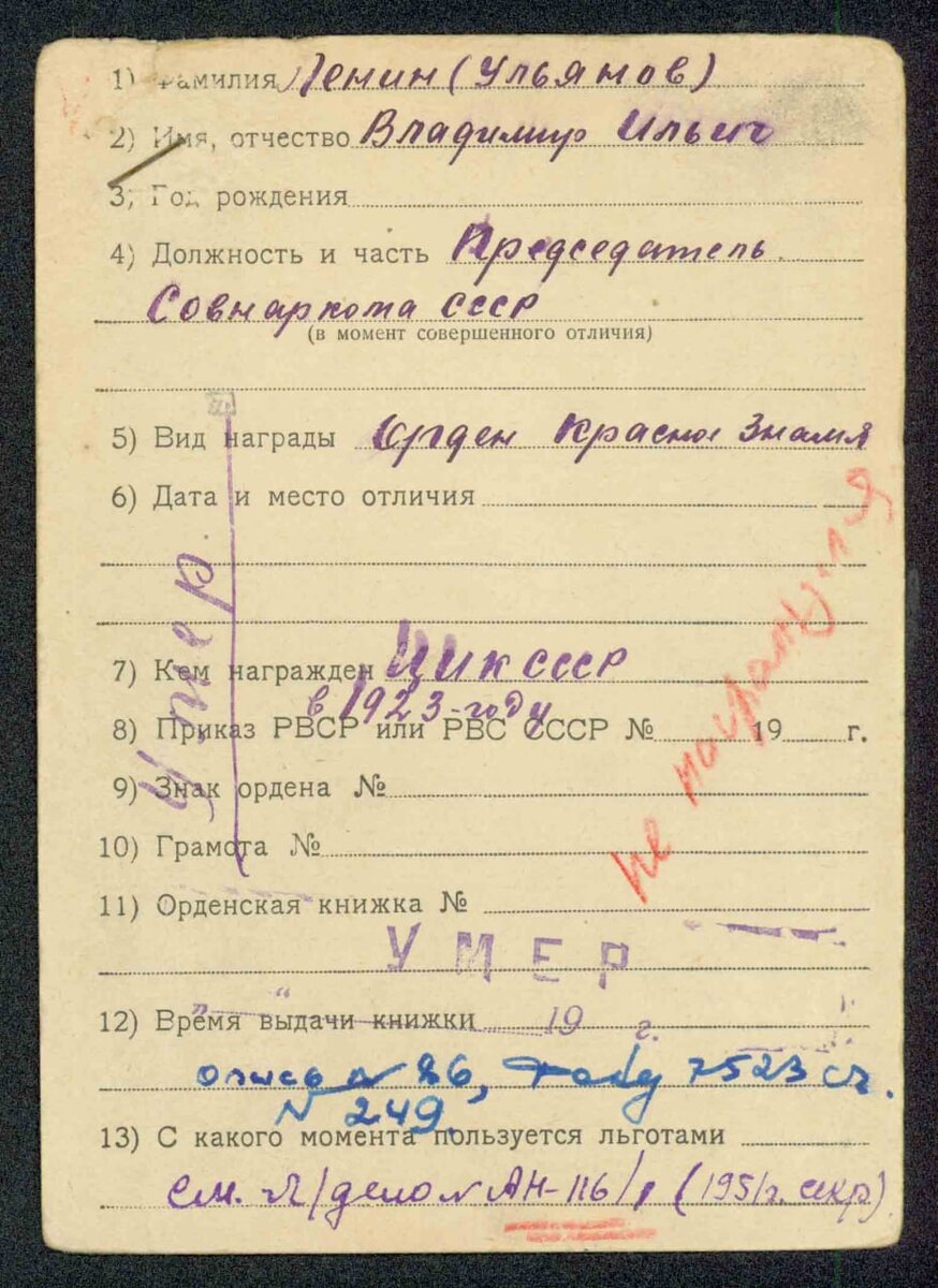 Убедительно просим, Михаил Иванович, помочь нам установить документально - кем и когда был награжден Владимир Ильич орденами Красного Знамени, так как десятки запросов трудящихся остаются без ответа.»