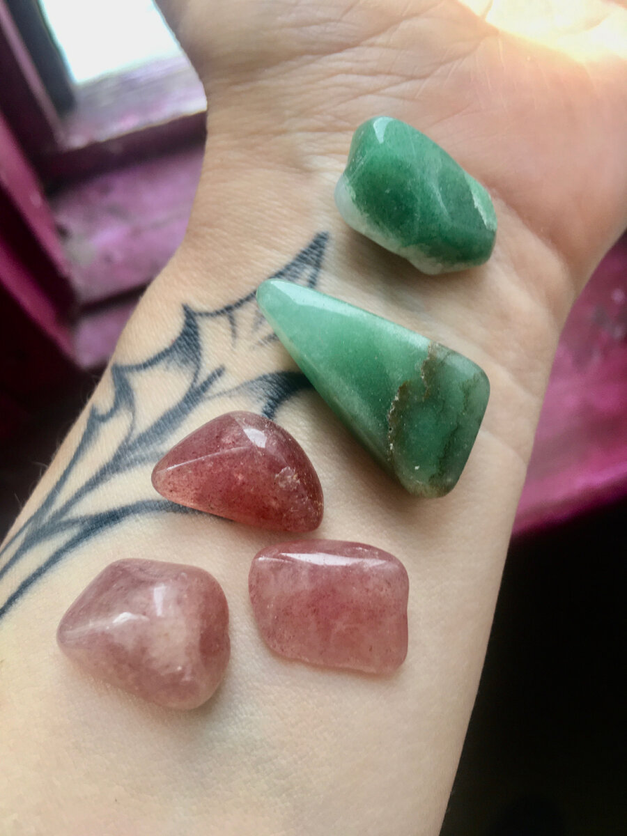 Для начала своего рода дисклеймер, предупреждение : камни не дадут вам того, чего в вас нет. Они только усиливают ваши способности. Или желания😏 Что ж, предупреждение сделано) Итак, Авантюрин. Он бывает разных оттенков. Действует в соответствии с названием и цветом. Общее воздействие авантюрина на человека и ситуации можно загуглить самостоятельно. Я расскажу о своем опыте дружбы с этим кристаллом. Первым моим Авантюрином стал камушек галтовки розового оттенка. Небольшой, примерно как зеленый треугольник на фото. И формы похожей. Но розовый. Он пришел ко мне лет восемь назад и сразу стал постоянным верным спутником. Путешествовал со мной повсюду от работы до походов в горы, от городских прогулок до романтических свиданий. Пару лет он кочевал из карманов юбок и джинс в кошелек или потайных уголки нижнего белья. Именно в тот период я сделала первую татуировку. Именно тогда я перешла к действиям в очередном цикле перемен в своей жизни. Розовый или оранжевый Авантюрин придает смелос